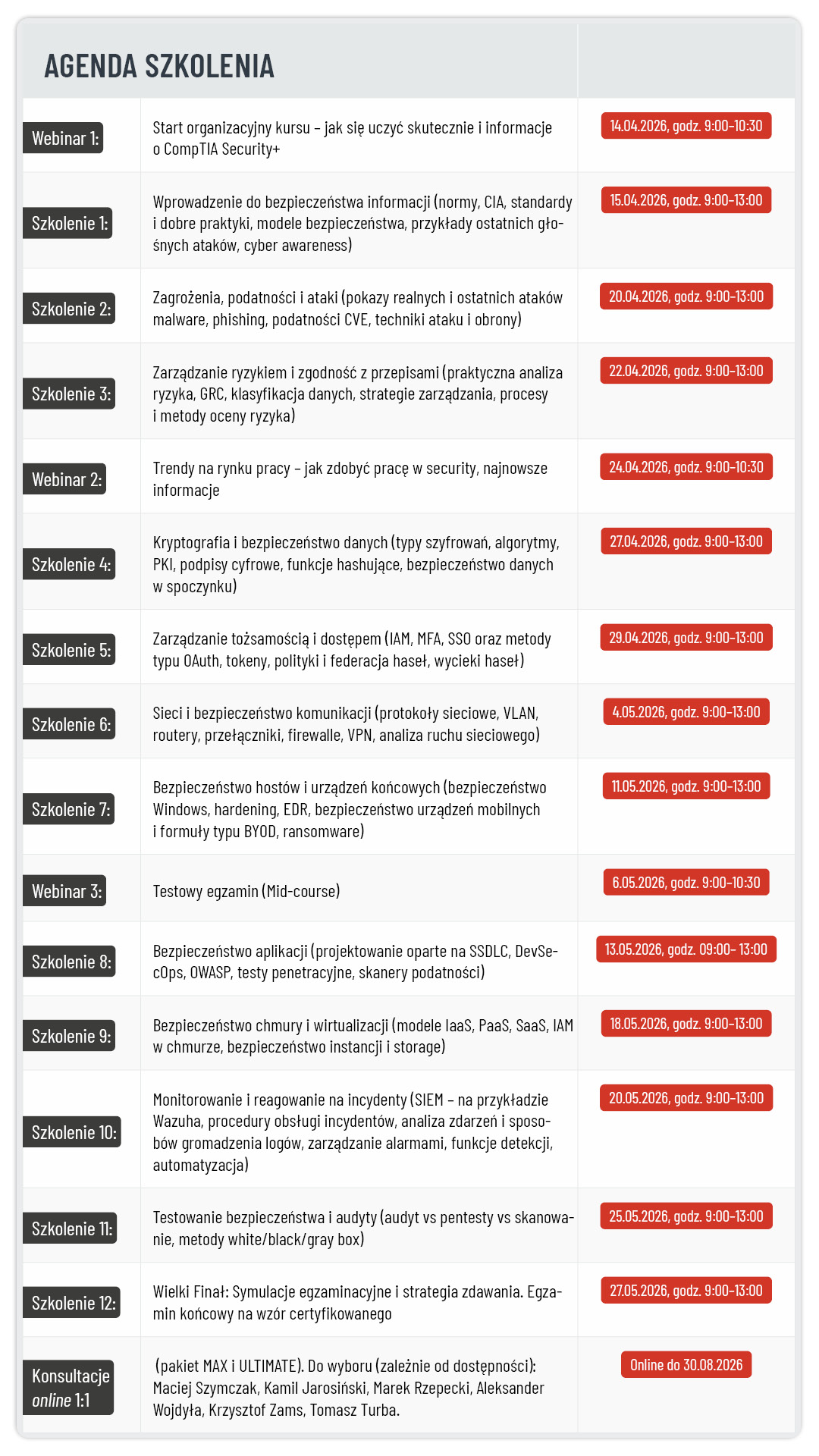 Szkolenie jest zaprojektowane w taki sposób, aby przygotować Cię do egzaminu SY0-701, ale jednocześnie dać Ci realne kompetencje, które wykorzystasz w pracy. Wśród trenerów są sami praktycy!